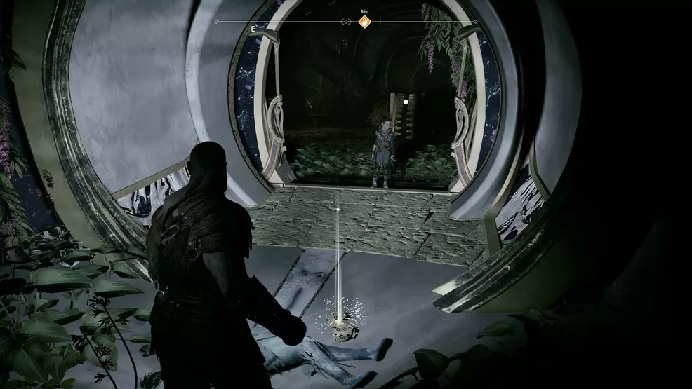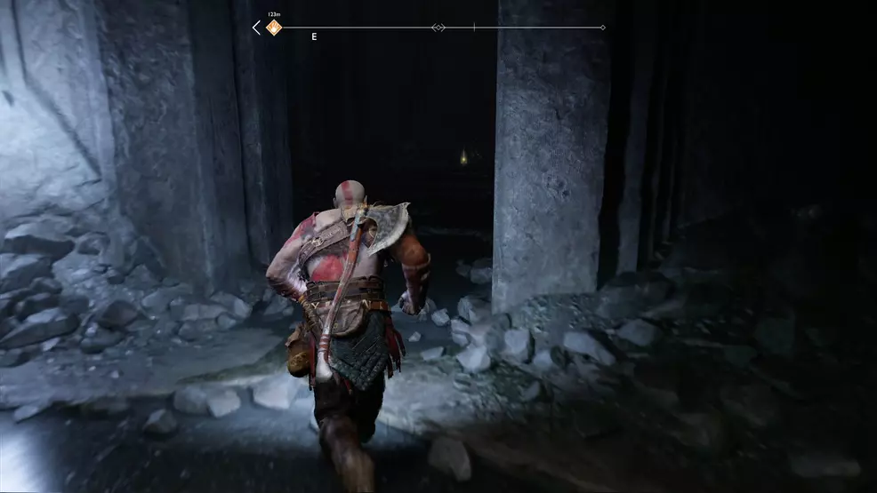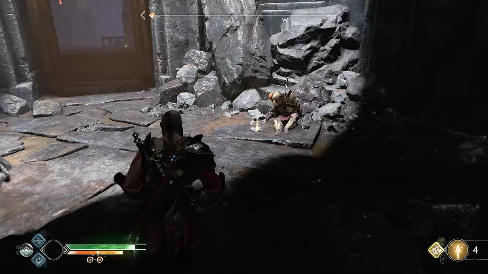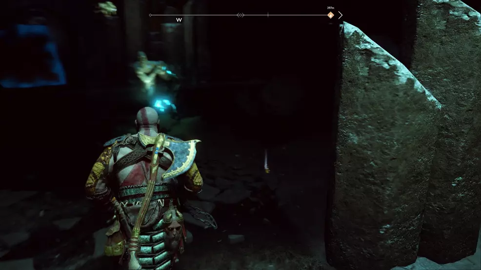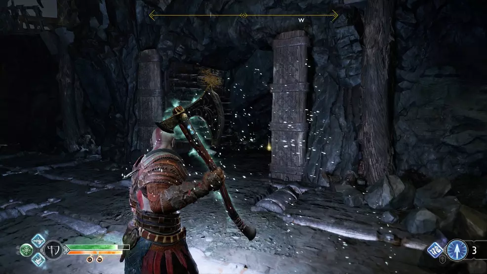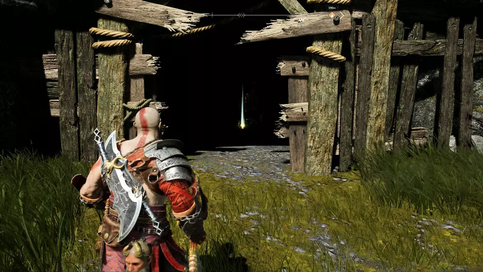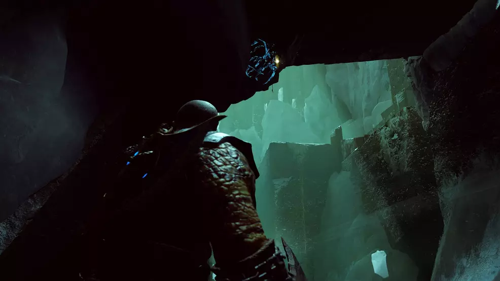 The offset Bottoms Up Artifact you lot can find is inside the mountain equally part of the main story mission, coincidentally called, Inside the Mount. Kratos and Atreus will enter an extremely dark cave with spinning machinery and blue crystals to shoot. Stick to the right-manus side until you come up across an ornate doorway barricaded with wood. Break through the forest and look backside the table on the opposite wall to find the Bottoms Upwardly Antiquity.